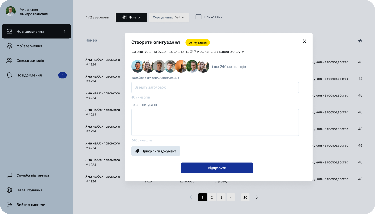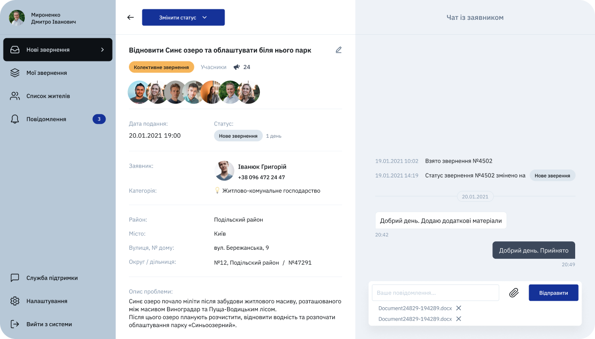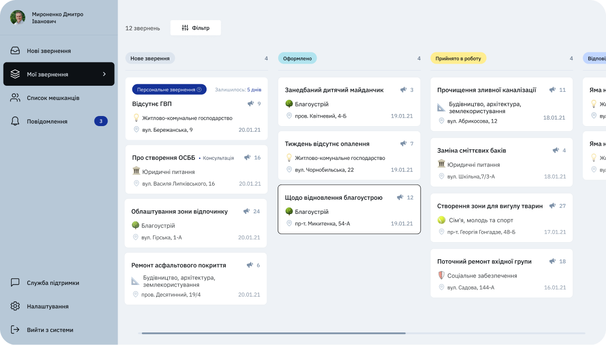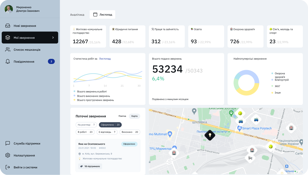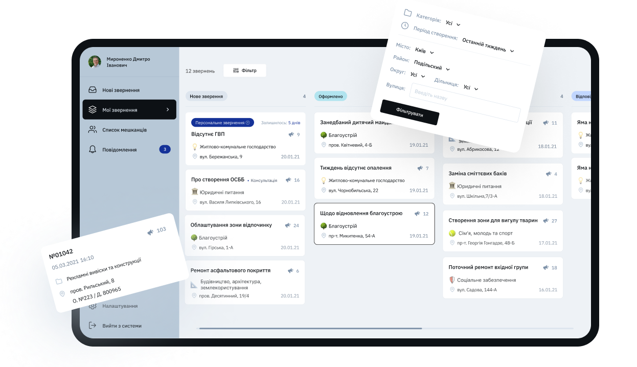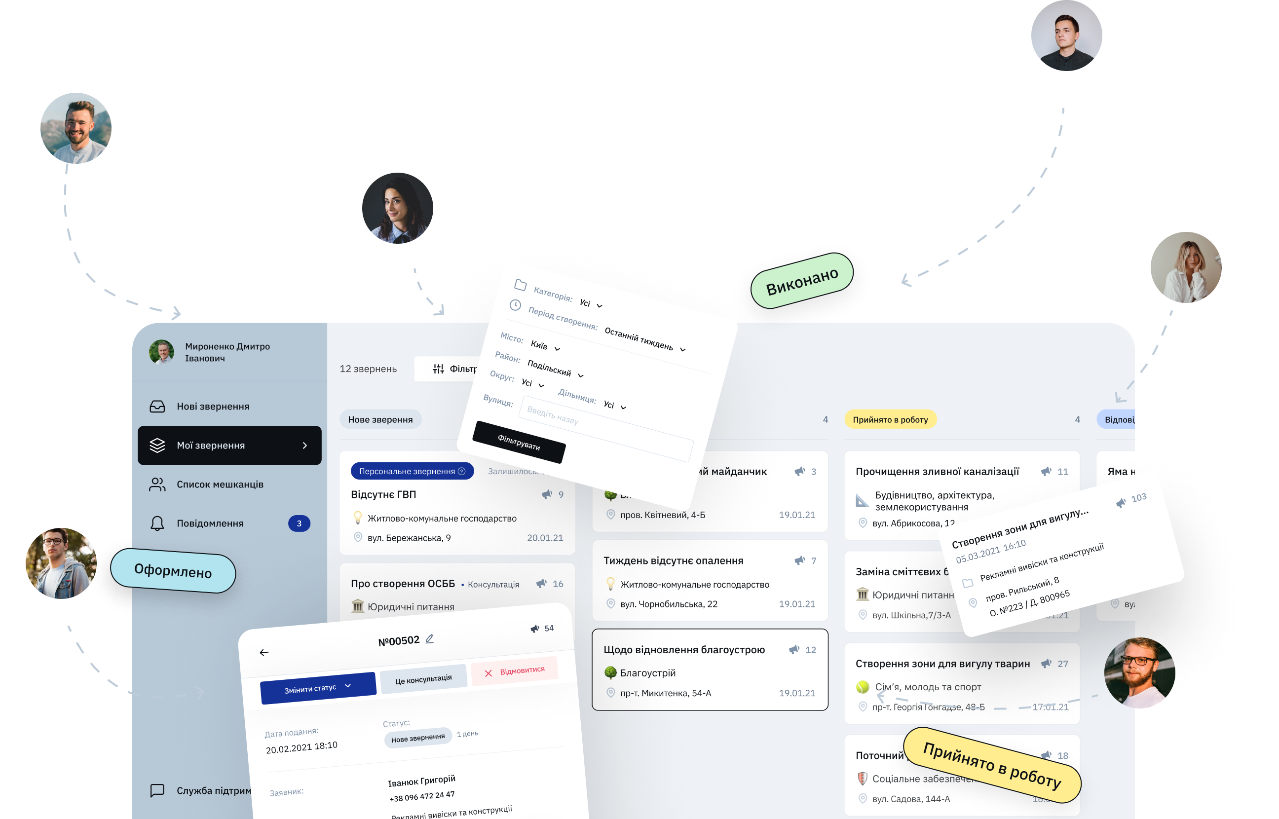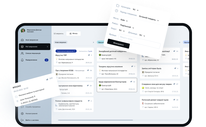 Отримуйте звернення, звітуйте про їх опрацювання та Ваші ініціативи, користуючись повним функціоналом у зручному інтерфейсі.